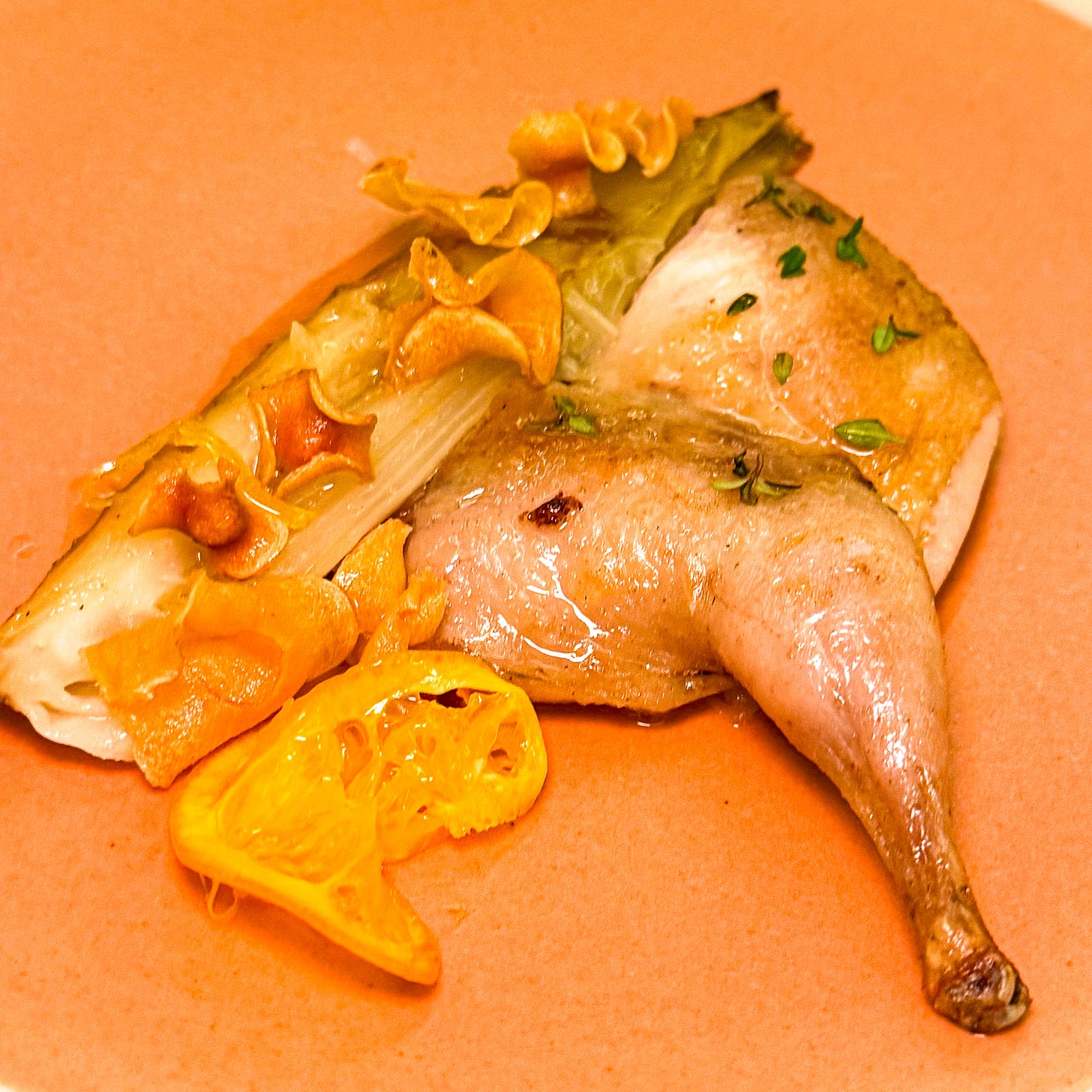 Not every dish was dominated by smoke and char. This caille á l’orange featured some beautifully (barely) cooked quail with confit orange, an intense hazelnut oil, and a deeply caramelized spear of endive topped with parsnip chips.