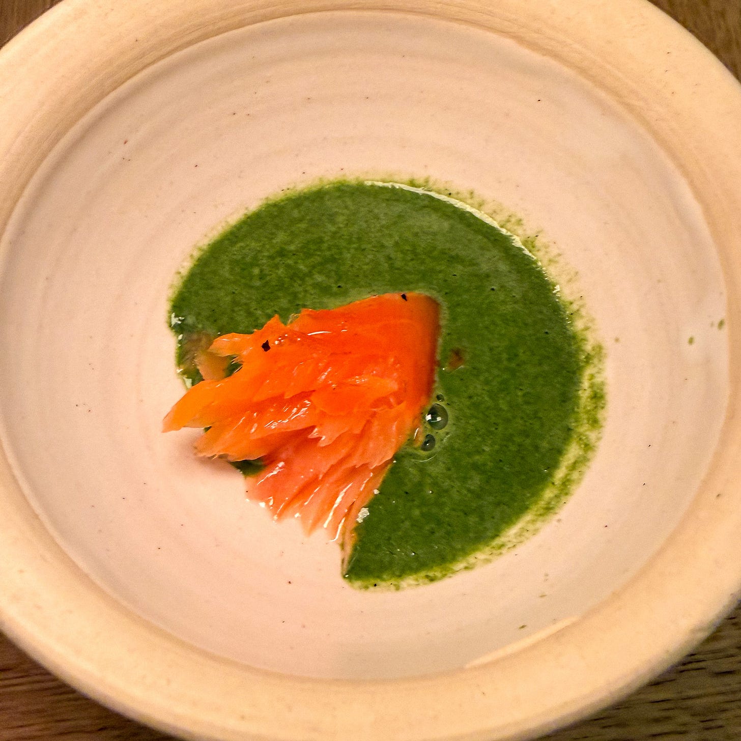 Next up: house-cured trout with a velouté of mâche (lamb’s lettuce). This might not look like much, but it was incredible. When I brought the beautiful dish up to my nose (they use ceramics from Nobuhiko Tanaka), it smelled like a barn. The trout had the most incredible slippery texture, and its gentle smoke was countered by the intensely green-tasting, slightly bitter velouté. Simple (-ish) and delicious.