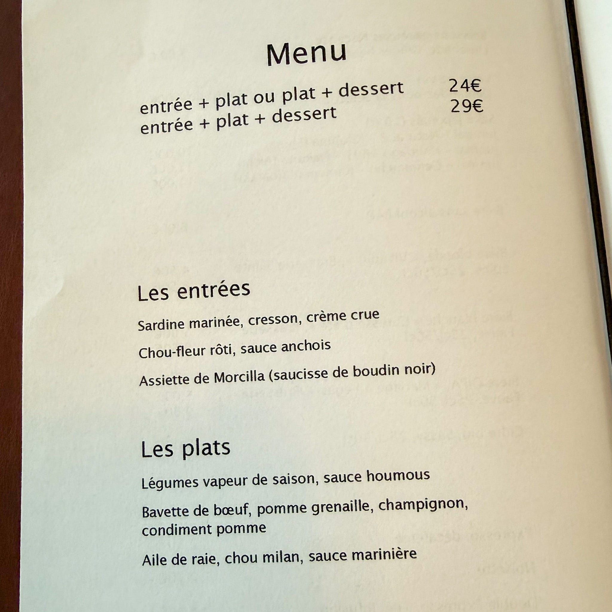 The price was right (24€ for two courses, 29€ for three), but the selection was slim. One of the starters was dried sausage. One of the mains was steamed veg. We were not exactly salivating at the prospects.