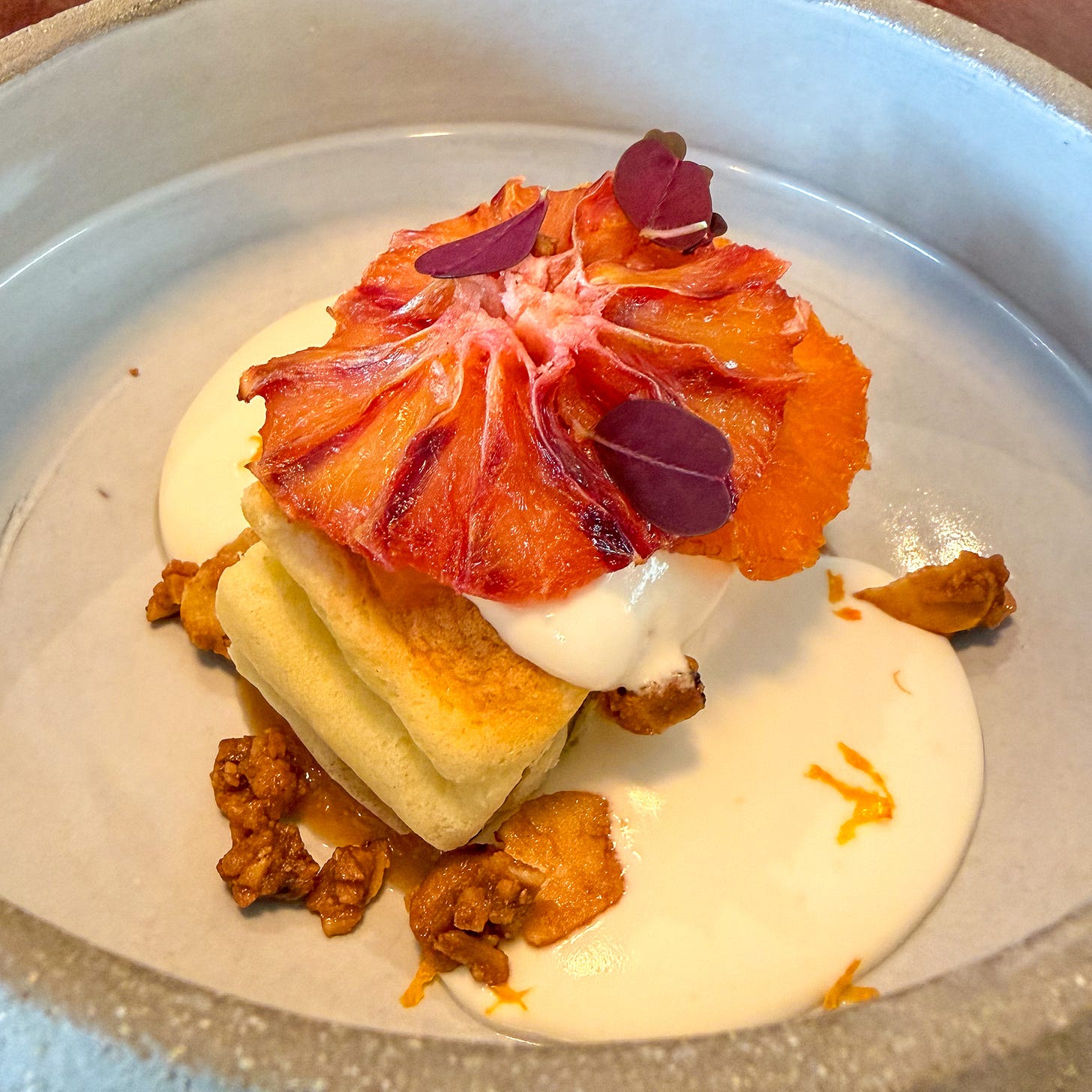 The castella dessert — Japanese sponge cake with blood orange and fromage frais cream — was the meal's best dish, genuinely beautiful and the clearest expression of what Kitano can do when cooking to her strengths.