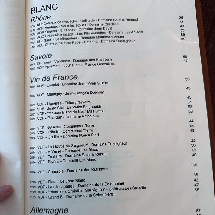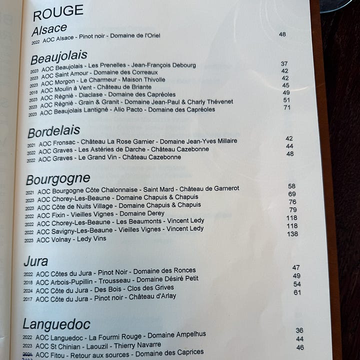 The wine list is a real strength at Épopée — it’s deep in natural and low-intervention producers with strong Alsace and Jura sections, interesting Serbian imports, and entry bottles from €32. They don’t offer a written by-the-glass list. That’s not uncommon in Paris, but it’s an approach that relies on good service. At Épopée, the server recites three options without description or enticement or really any light in their eyes. And then they fail to actually bring it, requiring you to walk to the bar to retrieve it yourself while your steak grows cold.