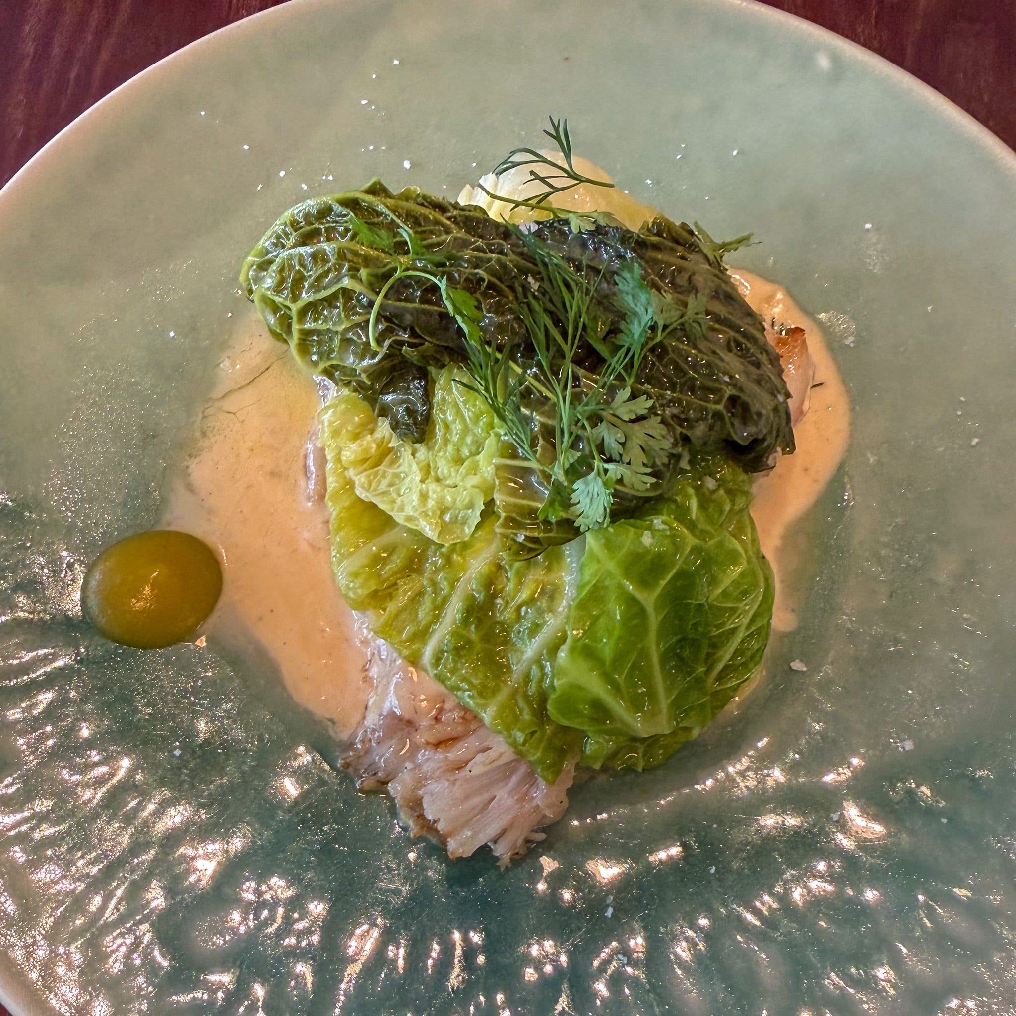 More successful was this plate of roasted cauliflower with anchovy sauce. The vegetable was deeply caramelized, the sauce assertive and rich, a dish that showed what this kitchen can do. It arrived on a beautiful scalloped ceramic in a portion roughly the size of a golf ball. One floret. After waiting for forty minutes. I would have paid five euros more for a real plate of it.