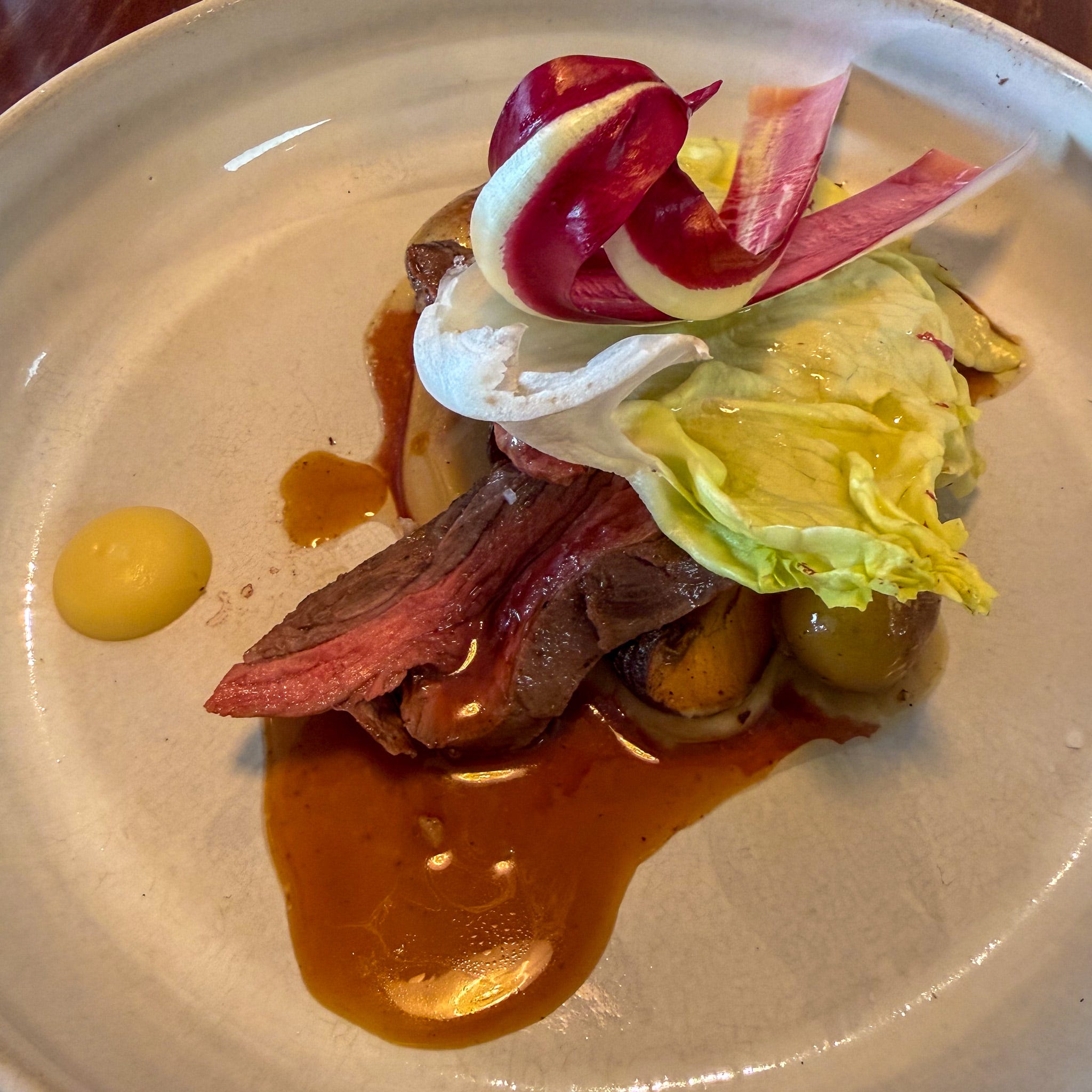 Here’s that steak, a bavette de boeuf with a jus that was genuinely good, served with mushrooms, potatoes, and some barely dressed radicchio. We liked it. We were happy to have some real food, 90 minutes after sitting down.