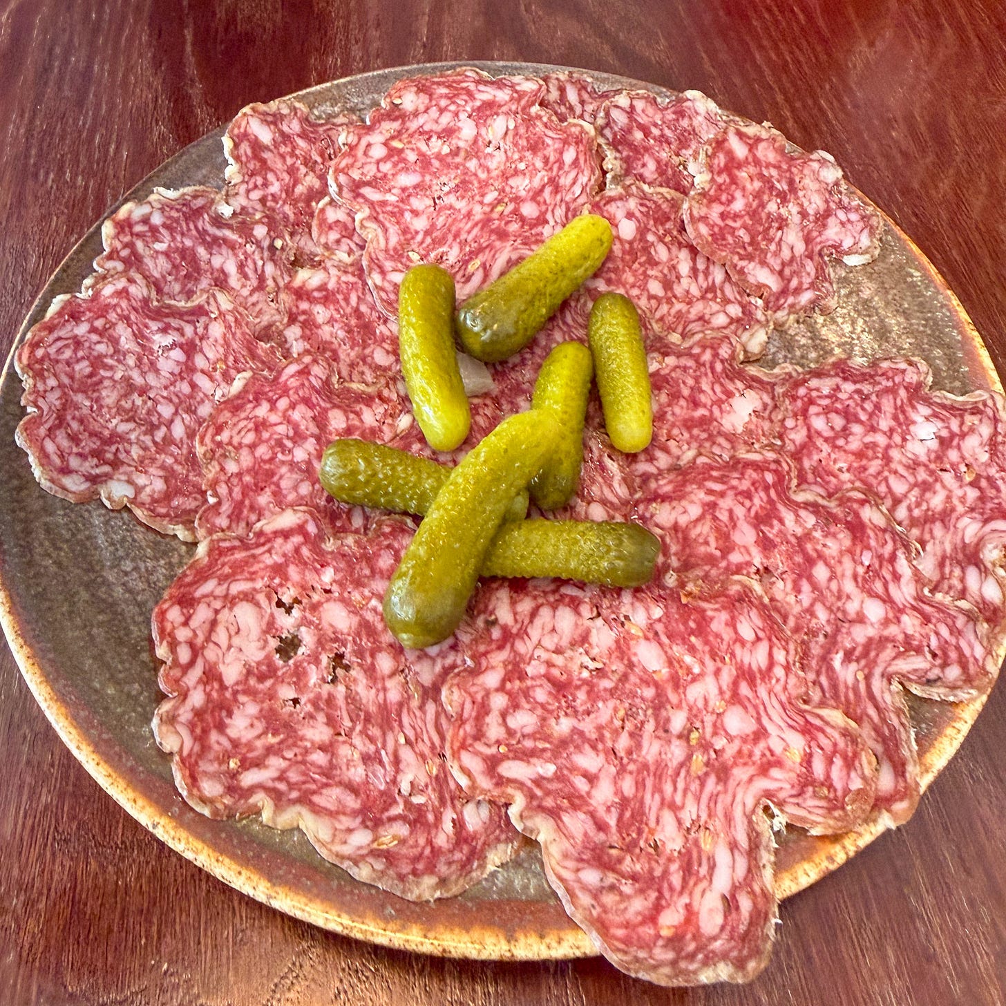But we were rather hungry, so we added a plate of different dried sausage to nibble on from their selection of snacks. That was fortuitous, since our starters didn’t arrive for forty minutes.