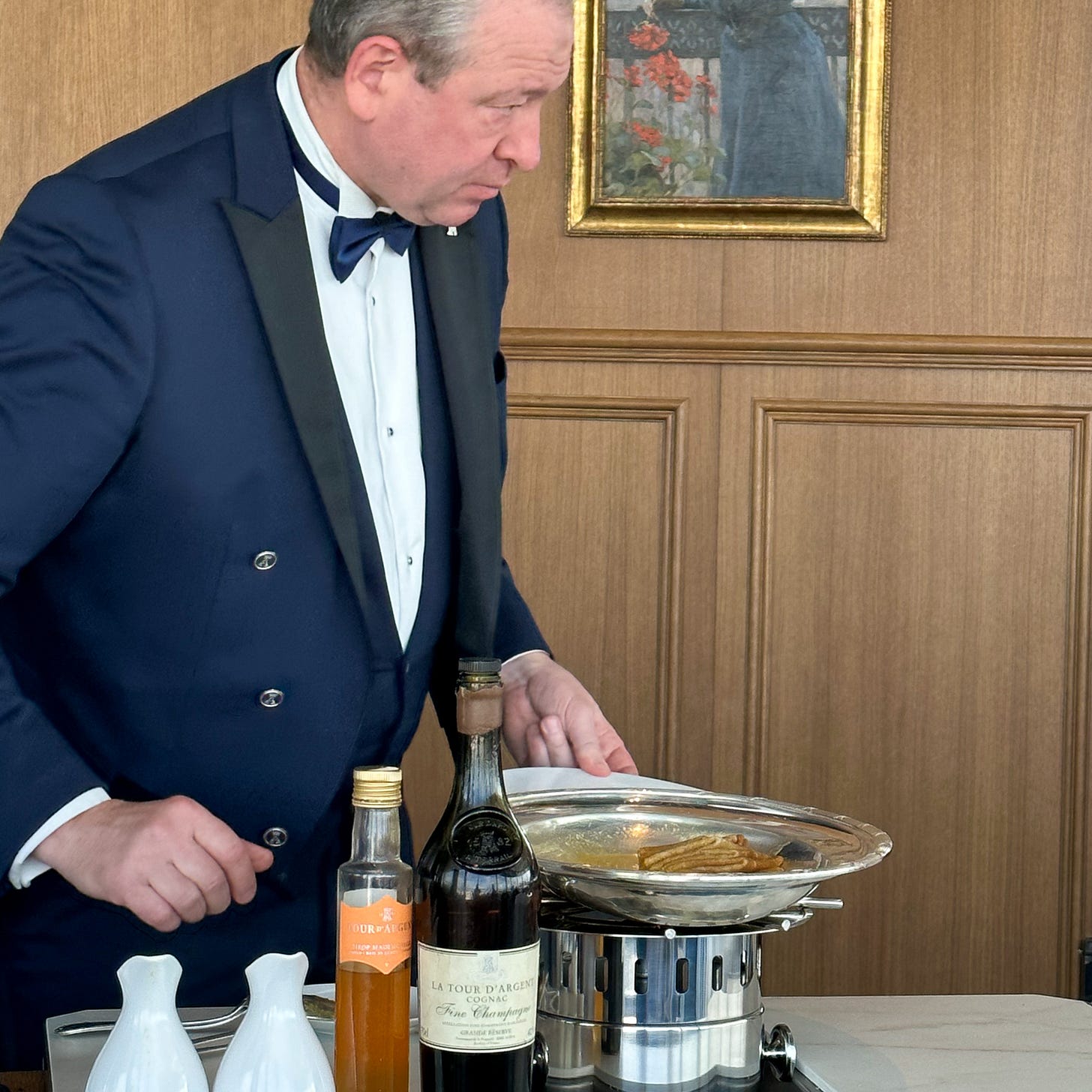 We were saving our appetite to instead try a supplementary dessert called Crêpes Mademoiselle (a play on Suzette), prepared very seriously at table side.