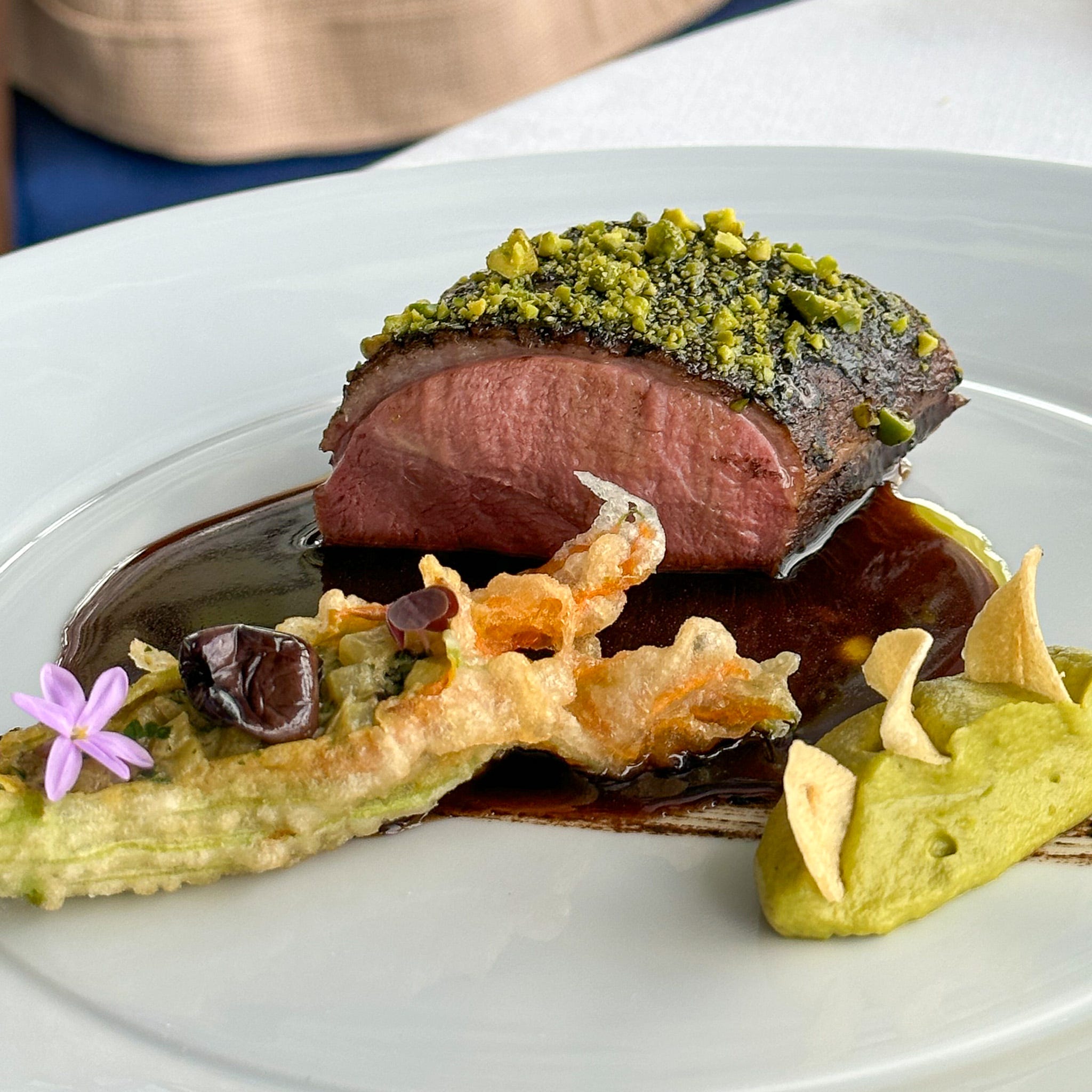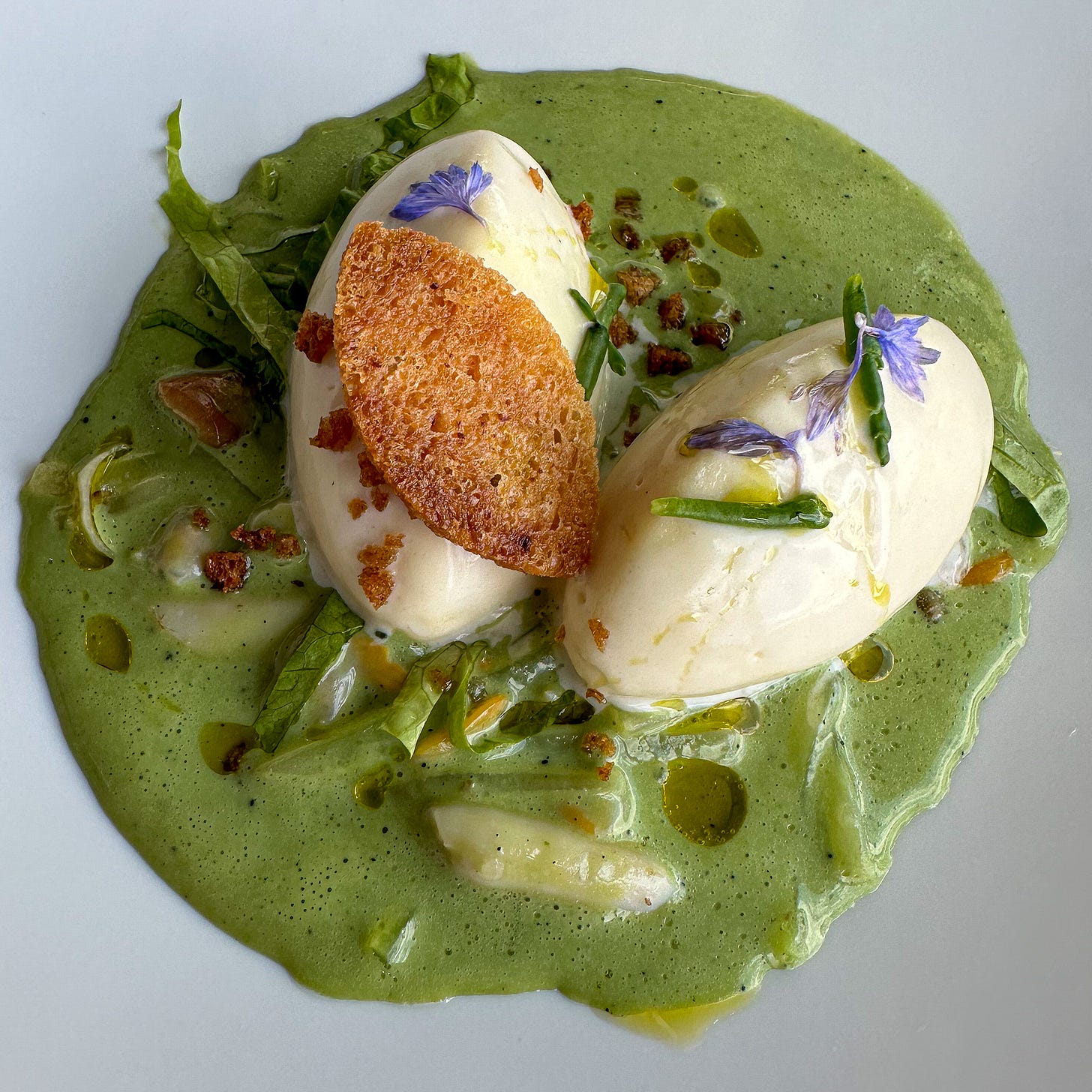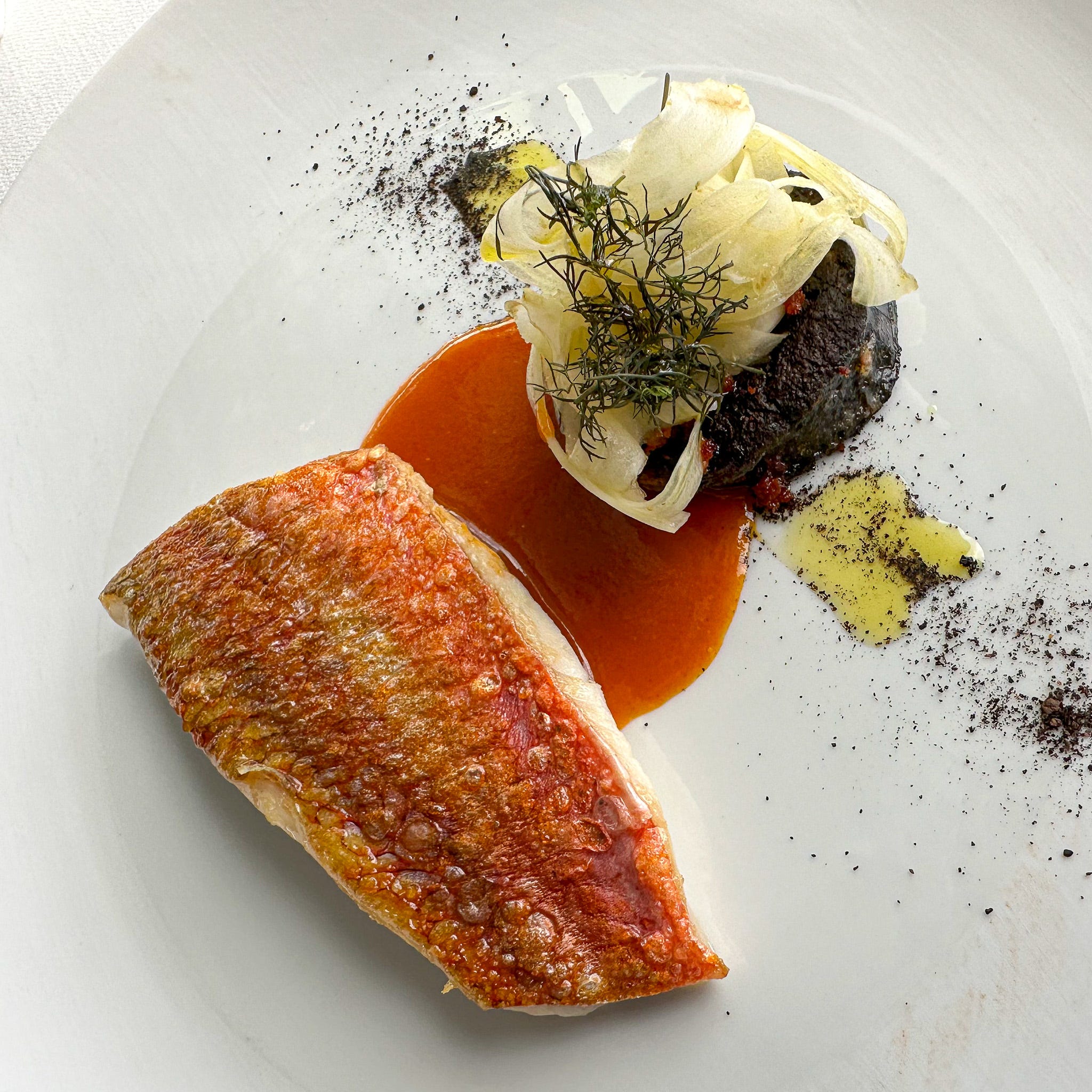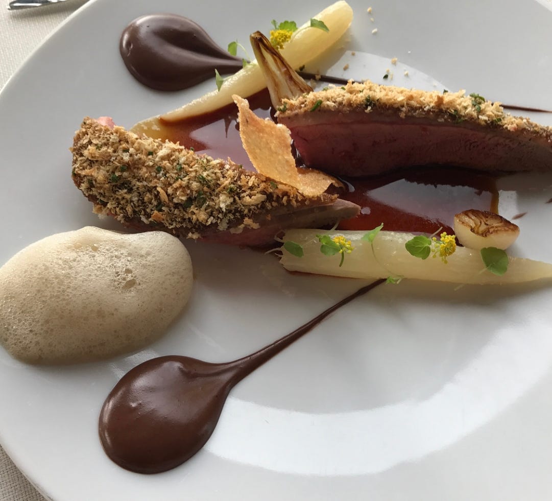 It was more than just pretty good. The most memorable dish was “duck with licorice foam, served with vegetables are turnips, a crackling cracker and dark red dabs of "sanguette épicée" or spiced blood sauce.