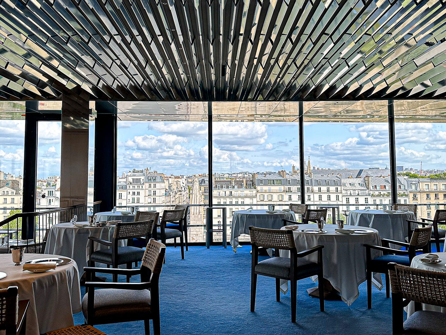 There’s really nothing that compares to the feeling of exiting the elevator on the sixth floor and entering this dining room. I find the new metallic ceiling to be wonderful. It mirrors the look of the rooftops across the water. All the other colors in the dining room seem to be reflections of what we see through the windows - blue carpet (water and sky), white tablecloths (clouds), grey seat bottoms (rooftops) and beige seat backs (limestone buildings). My only quibble about the renovation is the new outdoor walkway and railing that impose upon the extraordinary view.