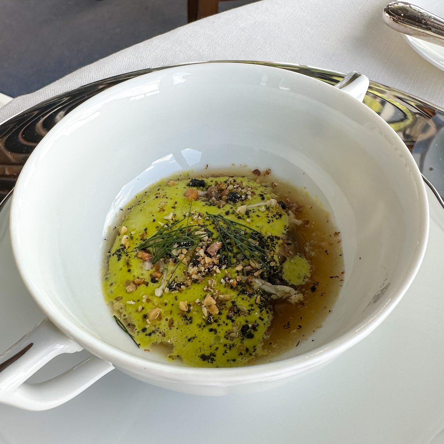 In the photo above, you’ll also notice a small table. It was wheeled over to hold the wine list - an absurdly large tome that couldn’t possibly be paged through in less than an hour. I put my guest Stephanie in charge of choosing the wine - she’s one of our incredible guides and has an advanced certification in wine (WSET level 3).