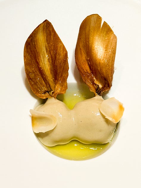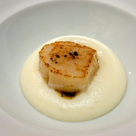 We started with this bite of artichoke with gilded leaves, an absolutely perfect scallop, and a rich savory Kouglof studded with lardons (bacon). All were fine - the scallop was more than fine - but nothing dazzled.