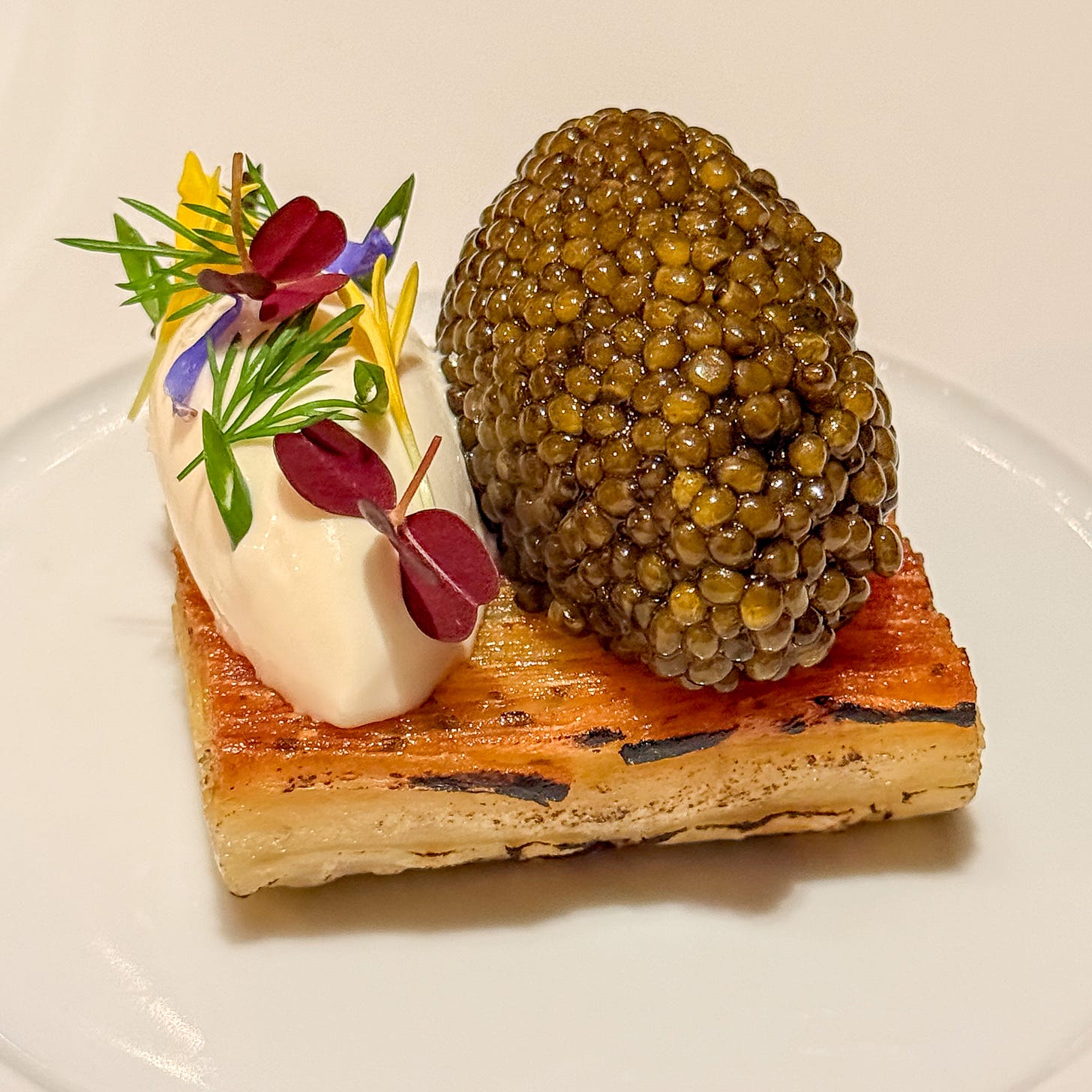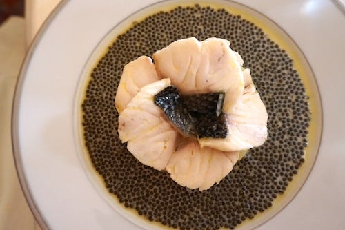 My companion ordered the caviar with celery, which floated quenelles of caviar and cream on a raft of celery root that had been cooked on the wood burning stove.