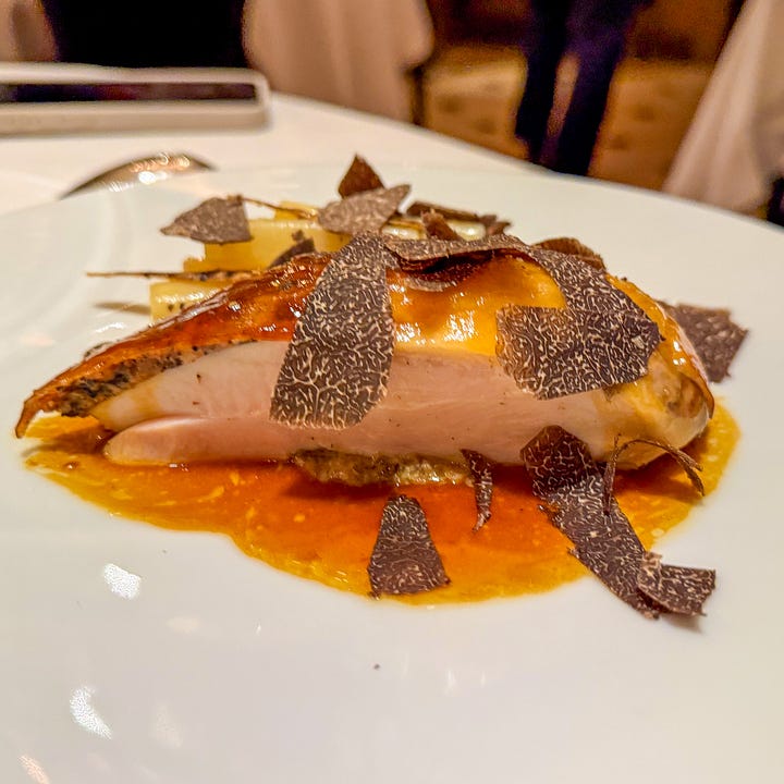 It was, as you might imagine, obscenely delicious. It was also - have these words ever been written? - too much truffle. We struggled to finish this dish because of the parade of rich foods that had preceded it. Our incredibly lovely server asked if we wanted to take the rest home, and he added the legs and a little bowl of jus to our package. What a lovely touch. But honestly, it felt like such a waste to leave heaps of uneaten truffle on the plate. I suppose there’s a feeling of glee for some people in being able to order a 380€ dish and disregard half of it. I’m not one of those people. At least not right now.