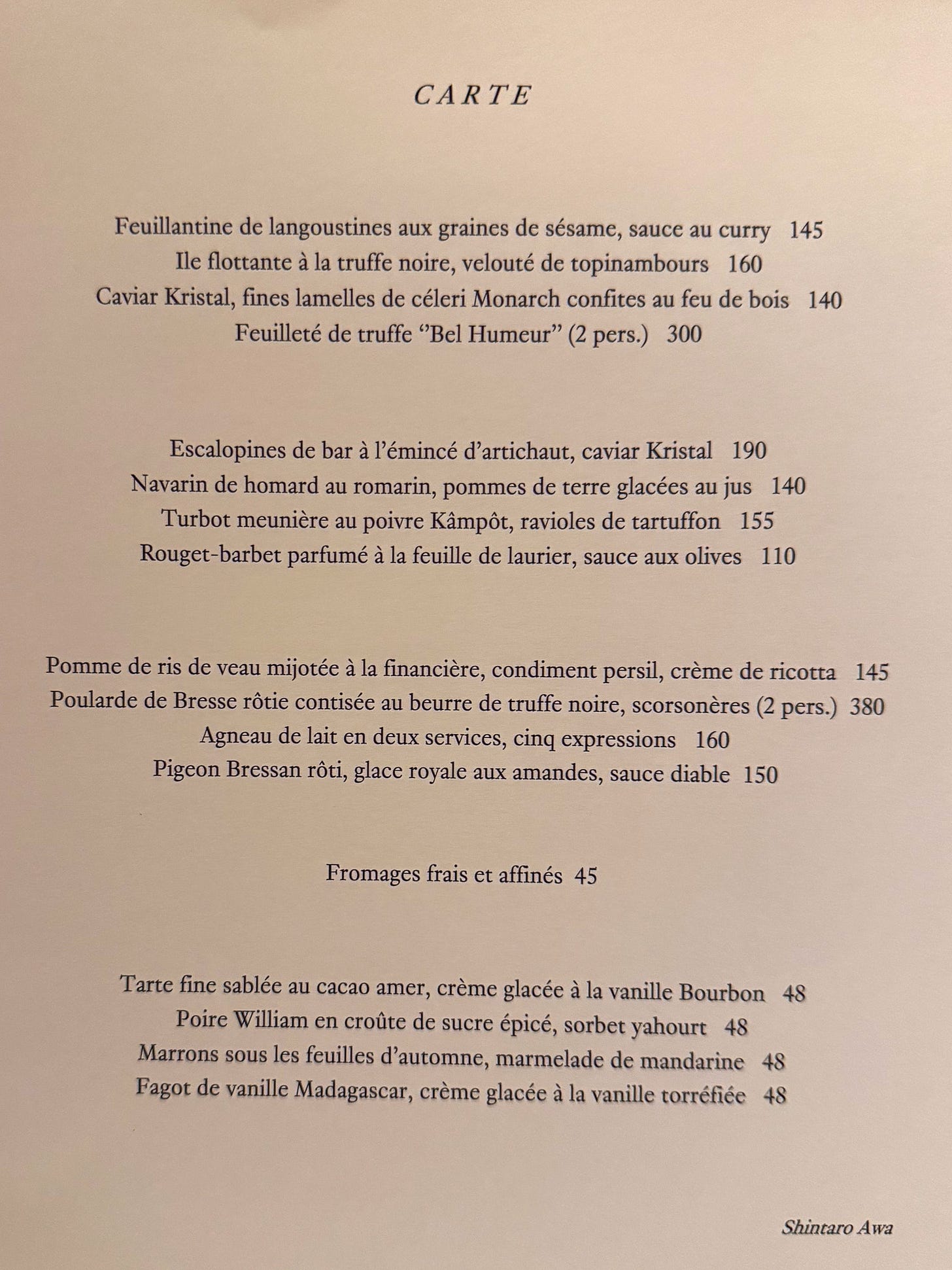 The chef now in charge of is Shintaro Awa, who was Eric Frechon’s second-in-command at Le Bristol’s Épicure for +10 years. He was not Pacaud’s first choice. Christophe Moret was engaged in 2023 for a gradual takeover at L’Ambroisie, but he left two months later without any official reason and is now at Le Domaine Les Crayères in Reims. Awa has an impressive CV, but little name recognition. That might be a positive feature, because Awa’s role at L’Ambroisie is that of a preservationist. He is tasked with recreating the same recipes that Pacaud himself repeated day-in and day-out for decades. His name is visible in small print on the carte, but is otherwise absent from the website.