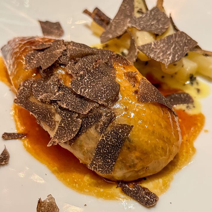 This is a whole Bresse chicken, rubbed with truffle butter and roasted. It was served for two with salsify and a heavy shower of black truffle.
