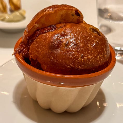 I opted for this turbot meunière. The flavor from kampot peppercorns was delicious, but the fish was too heavily dusted with flour and the thick mushy coating was a bummer. The truffled raviolis on the side were delicious, but all the cream and butter were starting to get to me. I say that as someone who is very used to cream and butter.