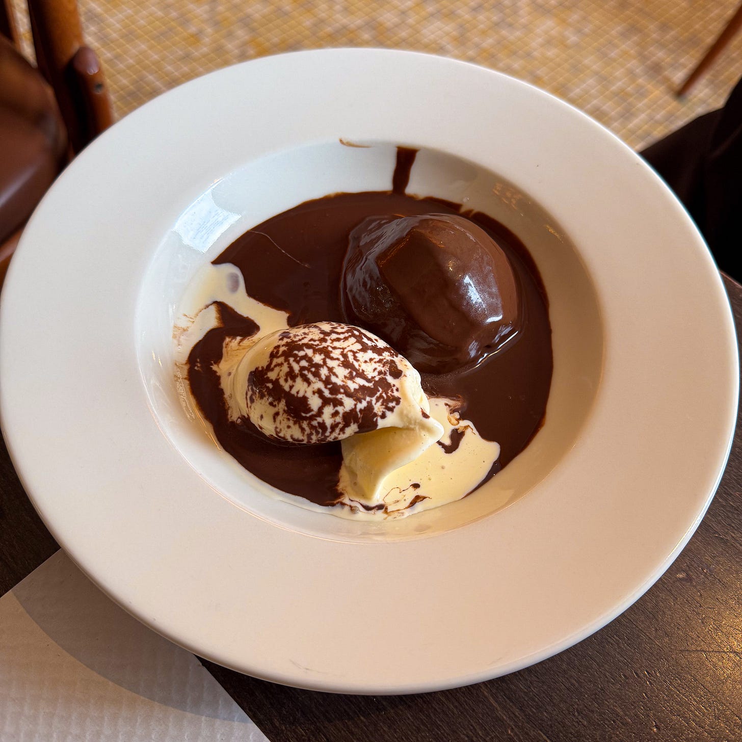 I didn’t have room for dessert, but I was curious enough to order it anyway. The classic Poire Belle-Hélène arrive as a perfectly poached pear coated in dark chocolate, paired with very good vanilla ice cream. Simple and delicious, like everything else here (9€).