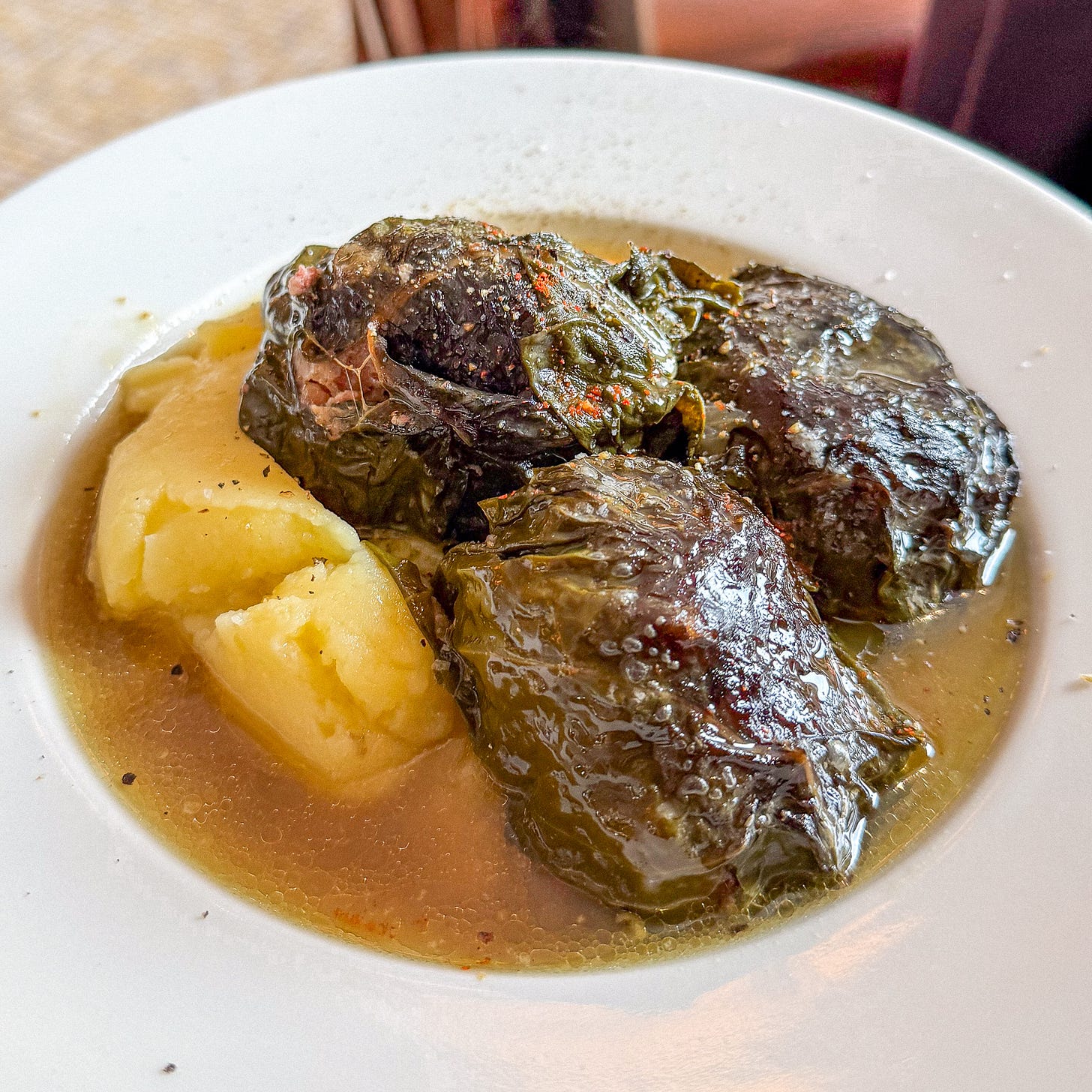 My main was more of a comforting dive back under the covers. Three balls of Swiss chard were stuffed with ground pork and nestled on a bed of potato purée with some delicious hot broth to warm everything through (me included).