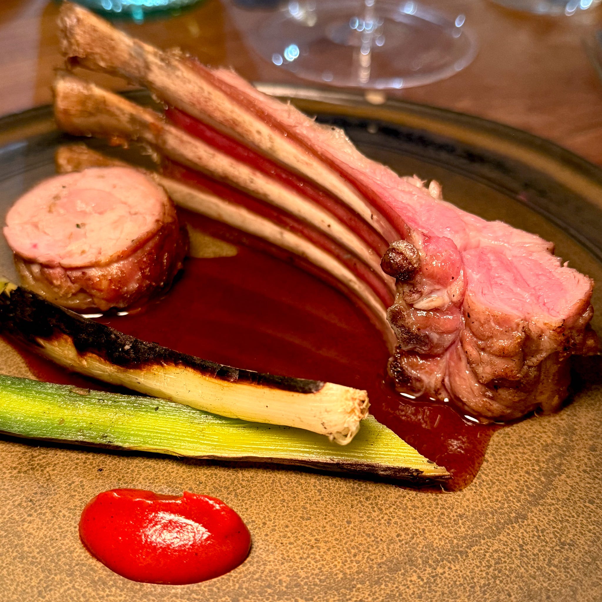 The meat course was lamb with charred green onion and harissa. The rack was rosy pink and served with a lamb roulade, charred green onion, a deep burgundy jus, and a dot of soft, smoky harissa. The plate was paired with Prieuré-Roch 2022 Vin de France, a rich Burgundy from the estate co-founded by the late Henry-Frédéric Roch of Domaine de la Romanée-Conti.