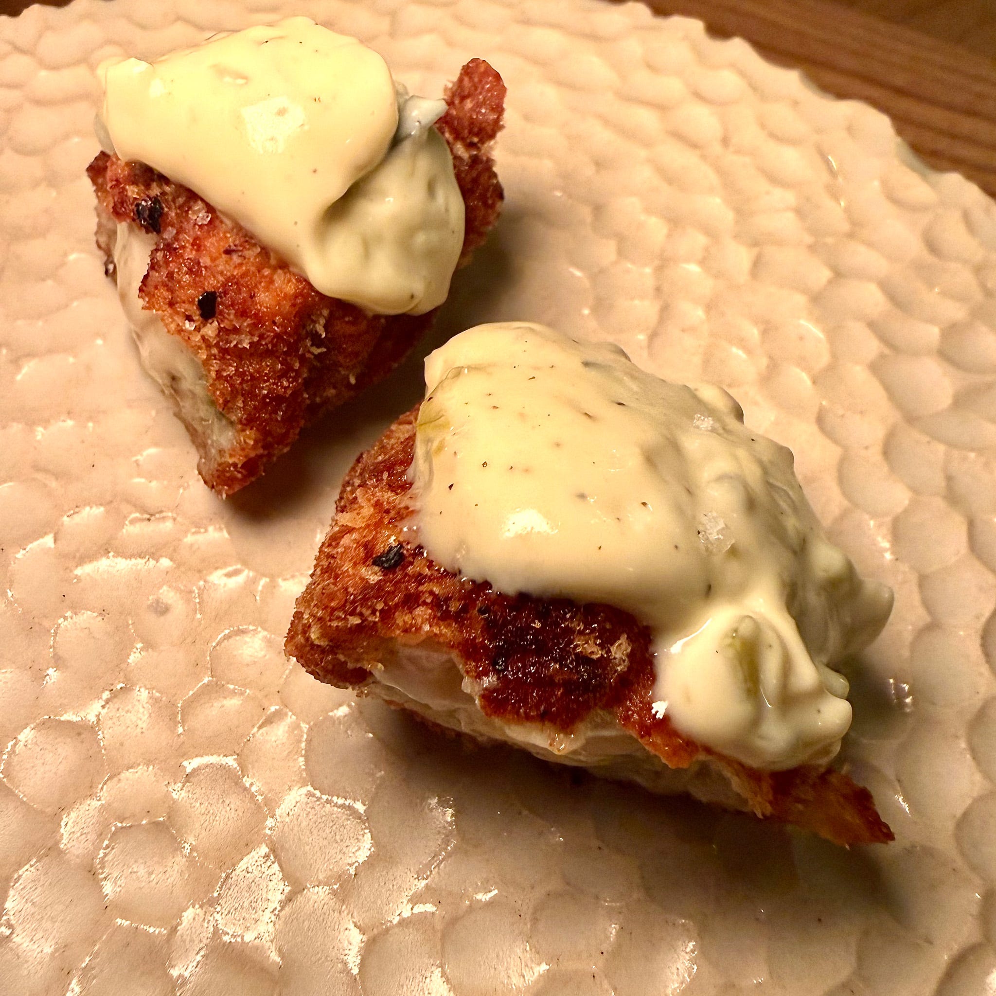 Another amuse bouche: two panko-fried oysters, shatteringly crisp outside and briny-soft within, topped with a generous spoonful of tartar sauce. Simple, greedy, gone in seconds.