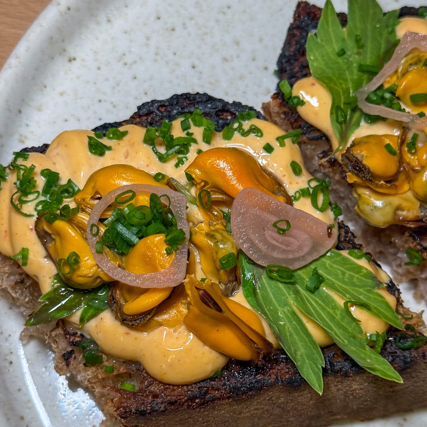 Pano Pano is a fascinating restaurant in the 11th that’s serving a menu of dishes that are based around bread and/or cooked in the bread oven. They offer small dishes, like these moules de Bouchot (mussles) on toast with rouille and pickled onions, as well as more substantial dishes like risotto made with three kinds of mushrooms with a bouillon made from country bread, or fried chicken coated with crunchy house-made panko.